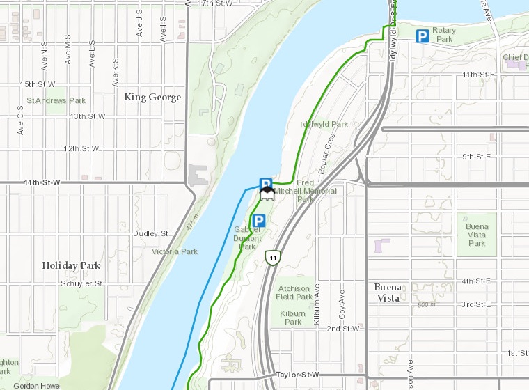 After North Battleford, the next major section of trail is in and around Saskatoon, with much of the distance in between being a paved roadway. The trails in Saskatoon travel throughout the city over the South Saskatchewan river and to the edges of greater Saskatoon. Much like in Saskatoon, a Pavillion marks the Trans Canada Trail entrance in Regina, and the pathways are often paved, or compacted quarry dust marked with well signed paths that connect urban spaces through an abundance of parklands. In the larger cities and towns across the country it is easy enough to create a unique pathway using the sidewalks to travel east or west that is not necessarily part of the designated TCT.