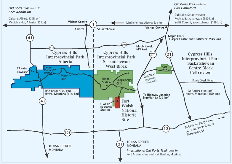 Alternatively, the Cypress Hills Inter Provincial Park offers another route for walking over the Saskatchewan and Alberta border. Extending 32kms between the 2 provinces the Cypress Hills Inter Provincial Path is 40kms due south of Lyoddminster and 10kms north of Canada’s southern boarder with Montana. Much like reaching the sidewalks of Lyodd accessing Cypress Hills requires travelling over paved road ways.