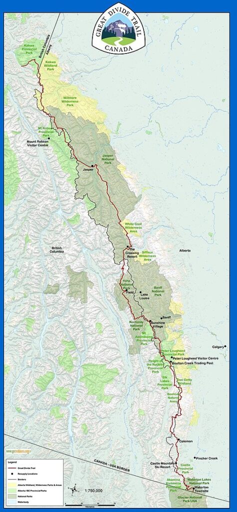 Much of the 1100km Great Divide Trail through the Rockies between BC and Alberta is seen as such, and therefore should require the expertise of experienced hikers or professional guides to attempt to traverse it safely.