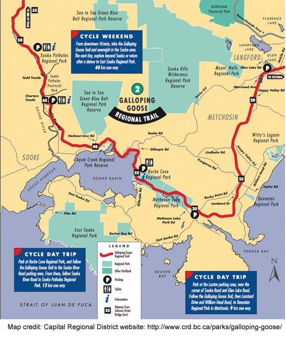 In and around Victoria on Vancouver Island one will find a much more developed and accessible section of the TCT, known as the Galloping Goose trail, where a lot of the foot / bike paths are paved with painted markers and abundant signage that connect urban spaces. And, of course, as an island, Vancouver Island is separated from the main part of the continent, so much like Prince Edward Island or Newfoundland, a boat or plane ride is necessary to connect the trail from or to these parts of Canada.