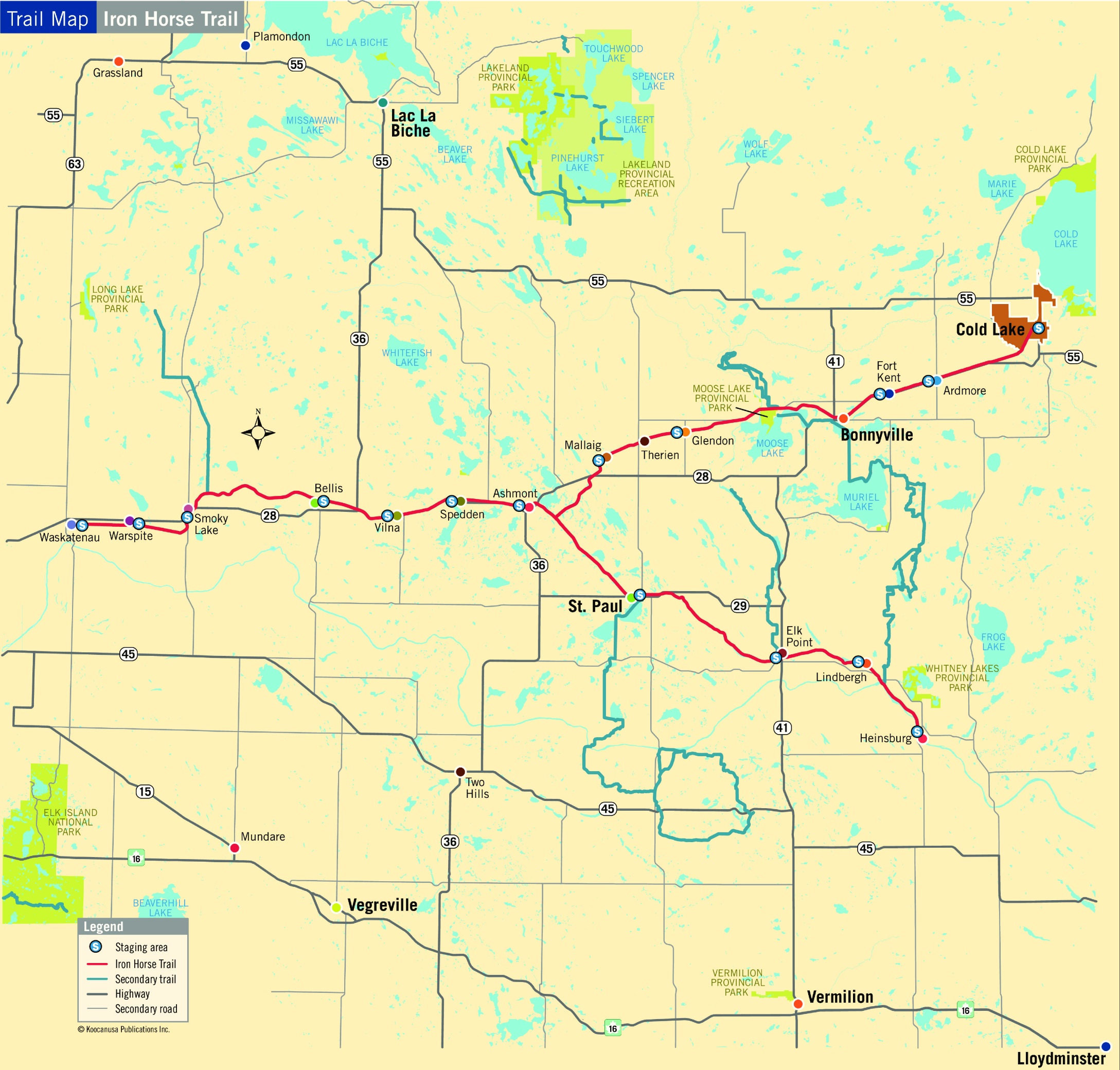 Alberta boasts one of the longest section of uninterrupted recreational trail in the country. Known as the Iron Horse Trail and only open to people on foot, horse, atv, and snowmobile, this pathway extends over 300kms along a repurposed rail line between Waskatenau 90kms north of Edmonton and Heinsberg and/or Cold Lake, both near to the border with Saskatchewan.